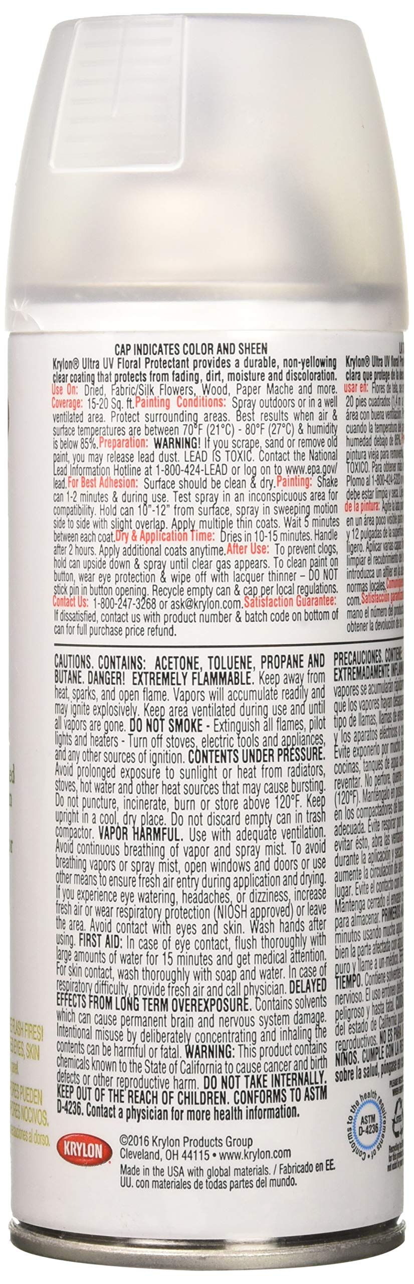Krylon-Ultra UV Floral Protectant. Protects silk and dried flowers from damage caused by damaging UV light rays. Can be used both indoor and outdoor. This package contains one 11.75oz spray can of ultra UV floral protectant. Conforms to ASTM D 4236. WARNING: Contents under pressure. Made in USA. WARNING: This product contains chemicals known to the State of California to cause cancer and birth defects or other reproductive harm. For more information go to www.P65Warnings.ca.gov.