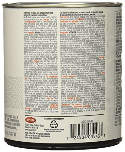 Easily turn most surfaces into a dry erase board with Krylon Dry Erase Paint. Create a writeable, erasable, and durable finish. This paint brush-on is ideal for use on wood, metal, wicker, plastic, glass, and papier-mâché. With easy one-step application, all it takes is one coat of this paint to create a whiteboard. Best results when surface, air and product temperatures are above 50°F. This write-on paint dries best between 65°F and 85°F at 50% relative humidity. Krylon spray paint has been trusted by consumers since 1947. We offer a wide selection of spray paint products to help restore, refresh and recolor any project. With Krylon, today we spray.