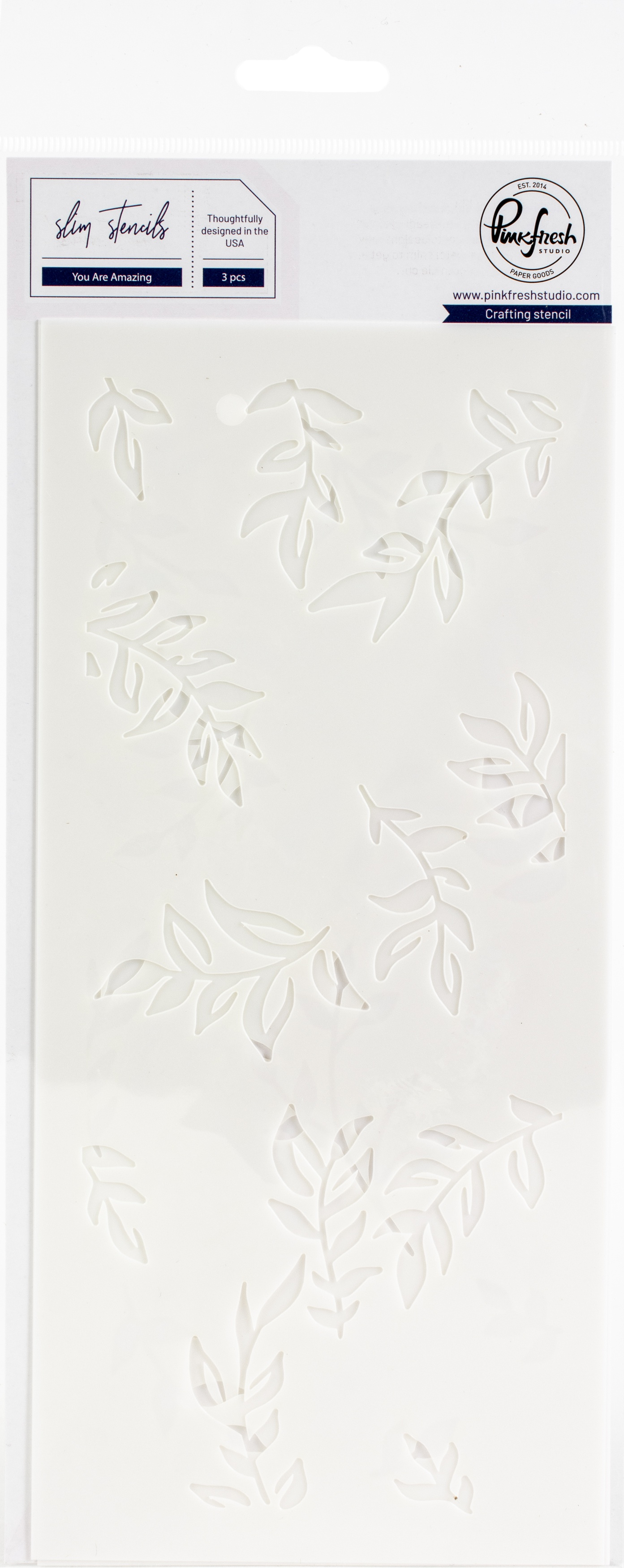 3 piece slimline layering stencil set made to coordinate with the You Are Amazing stamp set. There is a separate stencil for the 3 different layers of leaves. Use them without the stamped image for a soft, ink blended floral background. Use the cling stamp to add more detail to the image by stamping in detail black, or heat embossing in gold. You Are Amazing stencils measure approximately 4x9 inches.